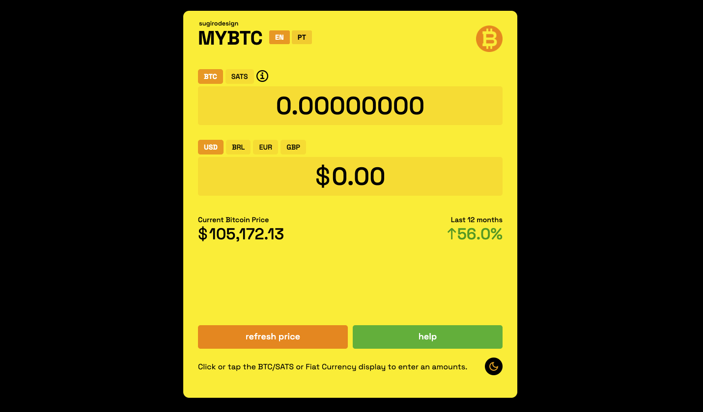 With MYBTC Calculator you can convert BTC or SATS to USD, BRL, EUR or GBP. Free, non KYC, easy to use.