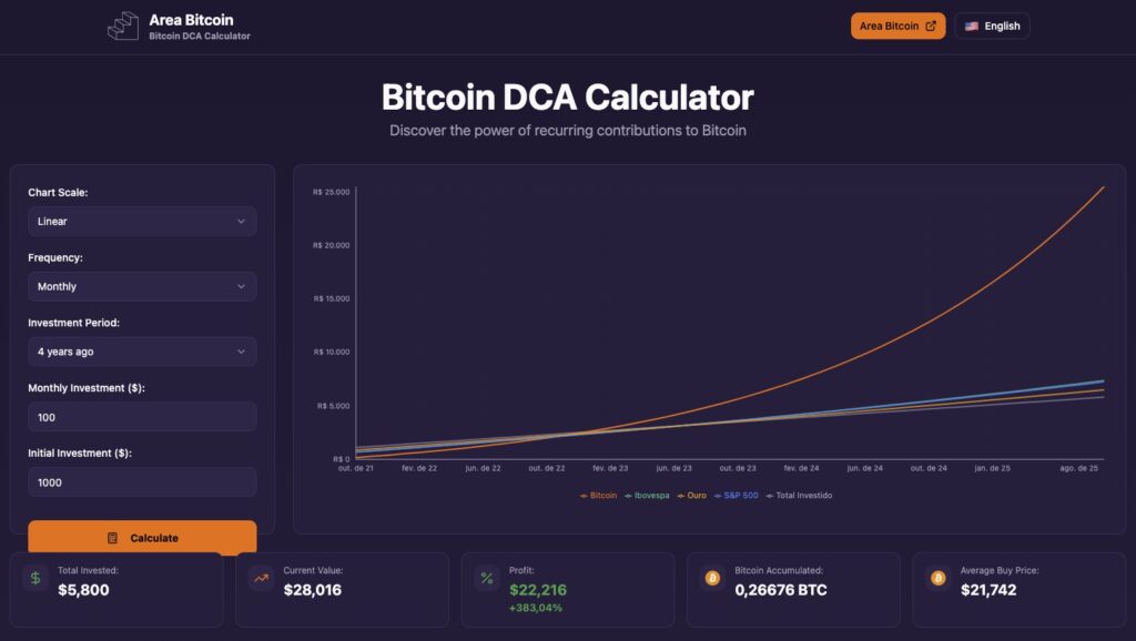 Visualize the power of recurring buys with Bitcoin DCA Calculator, from the creators of Area Bitcoin, Brazil’s larger Bitcoin education platform.
